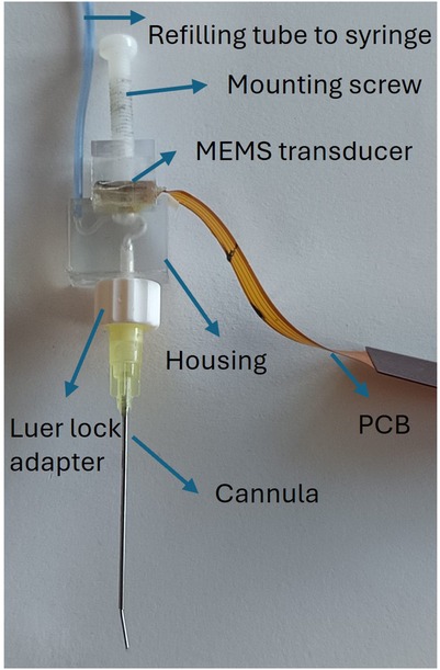 Figure 1. The probe assembly: the refilling tube connects a syringe to the housing inlet; the mounting screw holds the PCB-mounted MEMS transducer; the cannula is then connected to the housing outlet via a luer-lock adapter.