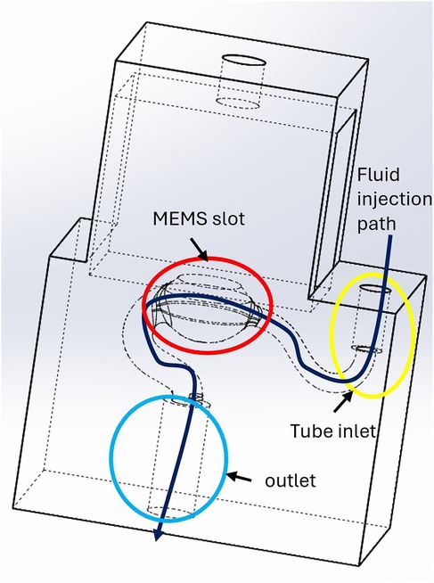 Figure 2. 3D-printed sensor housing connecting the pressure sensor to the cannula. To ensure proper filling, physiological saline solution is flushed along a channel that runs across the housing. The red circle highlights the slot for the MEMS transducer membrane, the yellow circle indicates the tube inlet, and the blue circle marks the outlet. The dark blue arrow illustrates the fluid injection path.