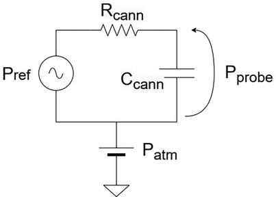 Referring to the equivalent circuit shown in Figure 3, the geometry of the cannula influences the dynamic transmission of pressure. According to Poiseuille’s law, the resistance of a cylindrical conduit scales with . Thus, the probe cannula radius must be carefully chosen, balancing damping of pressure transmission with anatomical constraints.