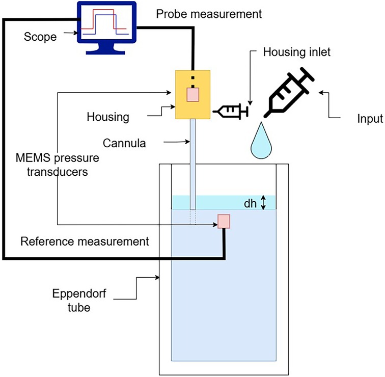 We compared our probe to a reference MEMS transducer fully immersed in a 50 ml sample tube. The setup is shown in Figure 4. The hydrostatic pressure was varied by adding and removing water in the sample tube manually using a syringe, creating stepped pressure changes. The procedure was repeated 10 times with three different cannulas. Between consecutive measurements, the cannula was refilled in order to observe repeatability of the filling procedure.