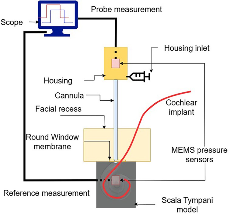 To assess the sensor’s usability, we performed CI insertions in a previously validated, high-fidelity artificial model of the temporal bone. The model’s anatomy is based on human CT scans and was extensively used in previous research (7, 19–22). To emulate the round window and retain perilymph perturbations within the cochlear model, a thin cross-slit sheet of parafilm was placed between the facial recess and the ST. The apex of the ST was connected to a piezoelectric pressure sensor, which we used as reference sensor, used in this configuration in (7, 21, 23). The facial recess and ST were securely anchored together. The fully mounted setup is shown in Figure 5.