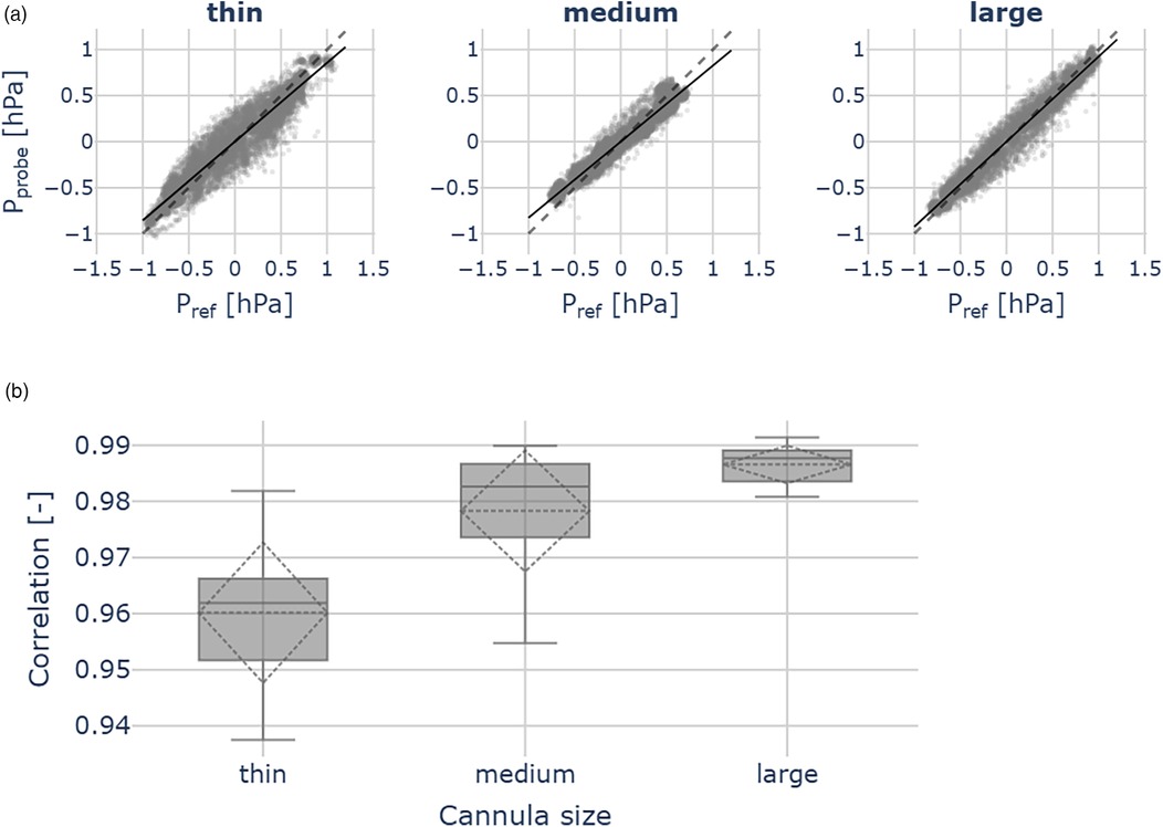 For each cannula size, we observed good agreement with the reference measurements. The median Pearson correlations for each group are: 0.96 (thin cannula), 0.98 (medium), 0.99 (large) (Figure 6a).
