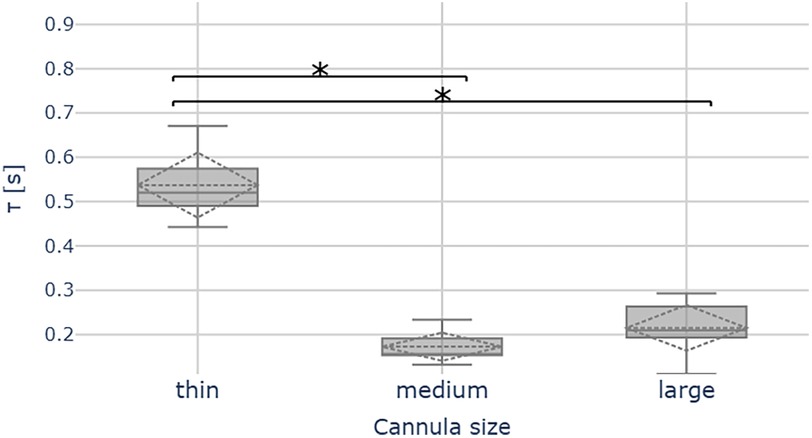 In Figure 7 we show the time constants extracted from pressure traces for the three separate cannulas. For each cannula, we computed the time constant of 9 subsequent pressure steps, present in a single trace, by fitting the sum of exponential responses, according to Equation 3. Time constants across the groups present significant differences (ANOVA: F = 93.61, p < 0.05). In particular, the strongest difference is given by the thin cannula reaching a median 0.52 s, approximately 2.5 times larger than the other two ( = 0.2 s). Between the medium and large cannula, no significant difference was observed.