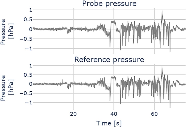 Figure 8. Pressure measurement during a cochlear implant insertion. Upper plot: probe pressure; lower plot: reference pressure.