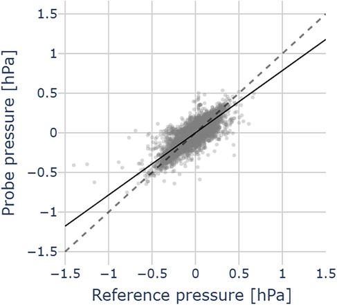 Figure 9. Pressure comparison between probe and reference pressures in 12 CI insertions in an artificial temporal bone model. Data points (grey dots), mean regression slope (black line), the grey dashed line represents the identity between probe and reference pressures.