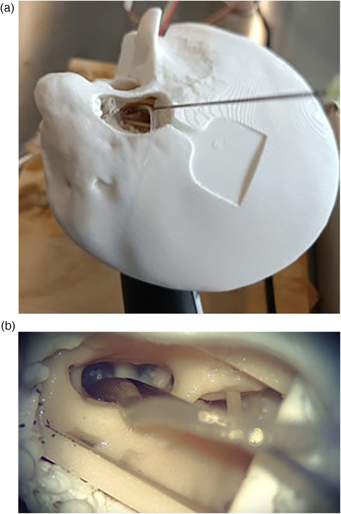 Figure 10. Views of the sensor cannula and CI placement from the surgical microscope. (a) Full temporal bone. (b) Facial recess.