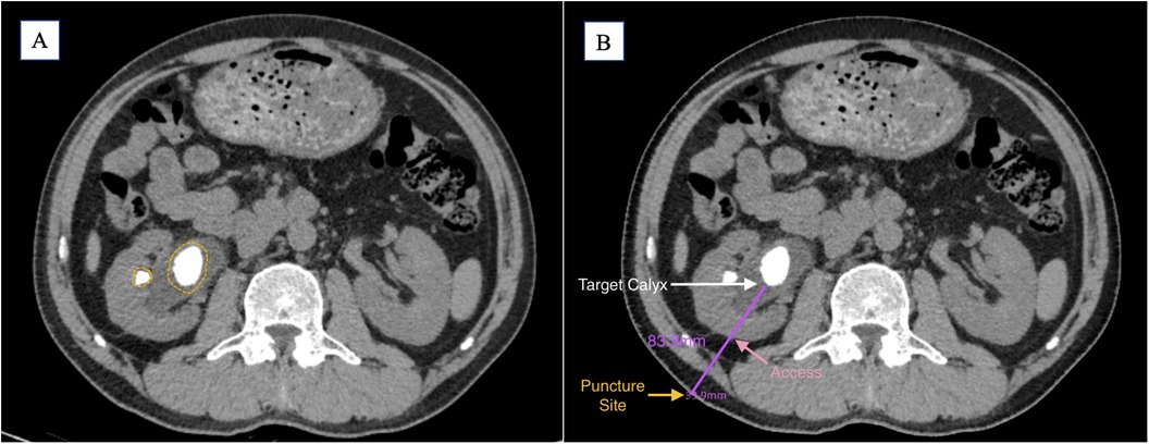 Figure 1. (A) Preoperative CT imaging shows the main stone located in the renal pelvis, with a small stone visible in the mid-anterior calyx (yellow circle). (B) Based on the preoperative findings, the target calyx is selected (white arrow); the shortest perpendicular path to the skin is indicated (pink arrow); the puncture point is marked (yellow arrow); the estimated puncture tract length is 83.9 mm (purple line).