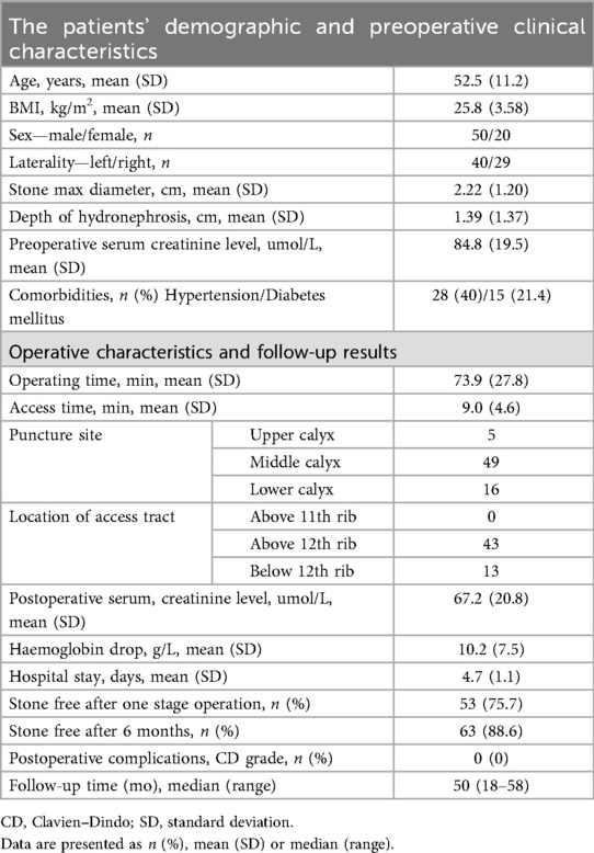 Table 1. Clinical outcomes of single-channel, rigid ureteroscopy-assisted ultrasound-guided percutaneous nephrolithotomy (PCNL) in the initial 70 cases performed by Dr. Gengyan Xiong.