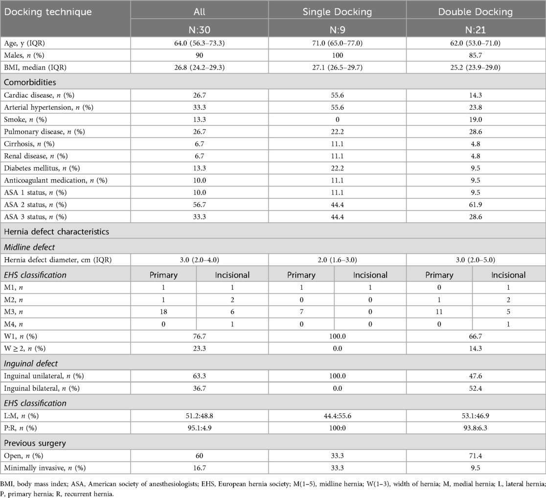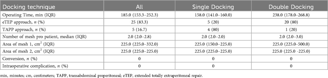 Regarding the intraoperative results, no complications or conversions were reported. When analyzing the surgical technique, the eTEP approach was predominantly used, accounting for 25 cases (83.3%). Among these, 20 cases (80%) belonged to the double docking group. In contrast, the TAPP approach was performed in 5 cases (16.7%), with 4 cases (80%) allocated to the single docking group.