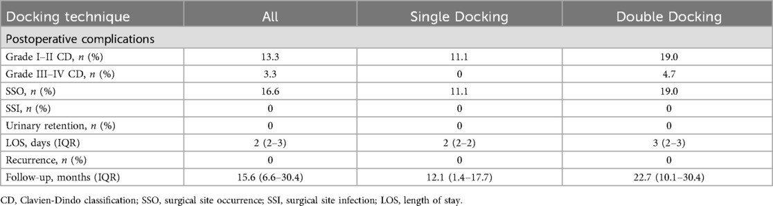 After surgery patients were followed up at one month and then after one year. In all our series, at a median follow-up of 15.6 months (6.6–30.4), 12.1 months (1.4–17.7) for the single docking and 22.7 months (10.1–30.4) for the double docking, no recurrences were observed. Postoperative parameters and follow up details are described in Table 3.