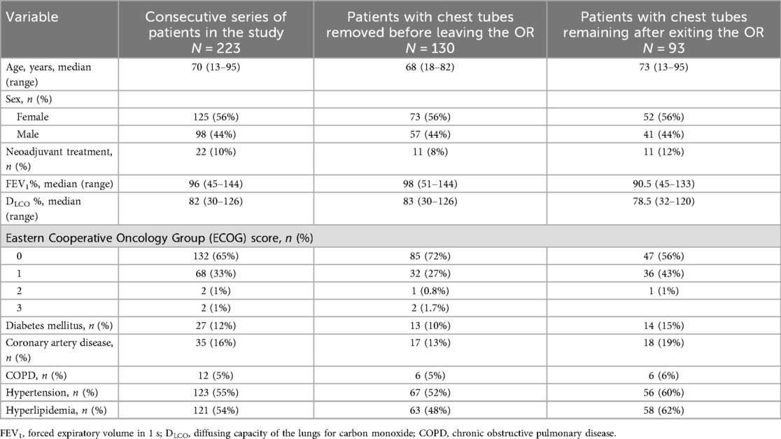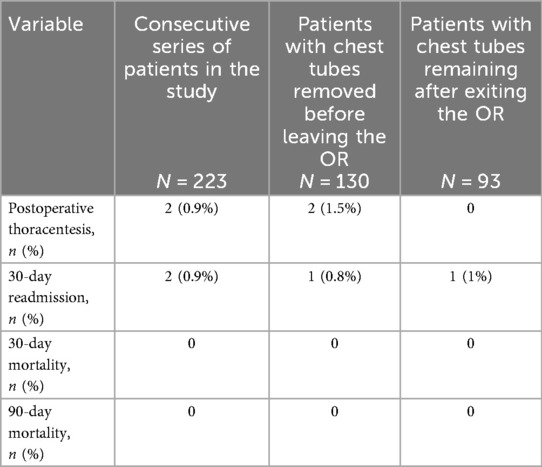 Table 1. Demographics and patient characteristics of the overall cohort, of patients whose chest tubes were removed in the OR, and of patients whose chest tubes remained in place in the OR.
