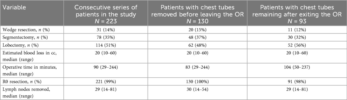 Out of the entire cohort, 130 patients (58%) had their chest tubes removed in the OR. The tubes were removed in 62 of the 114 patients (54%) who underwent lobectomy, 48 of the 78 patients (62%) who underwent segmentectomy, and 20 of the 31 patients (65%) who underwent wedge resection.