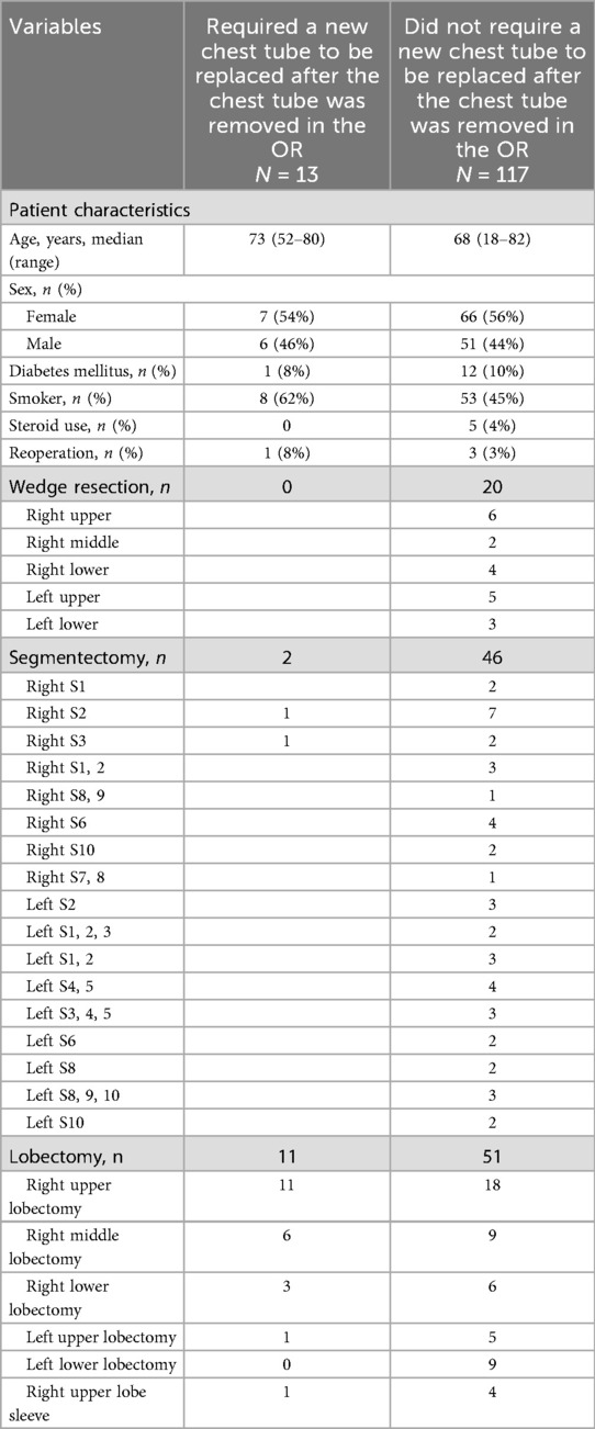 Table 4. Patient characteristics and operative details of patients who required chest tube reinsertion as compared to those who did not.