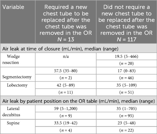 Thirteen out of the 130 patients (10%) whose chest tubes were removed in the OR required a chest tube reinsertion within 6 h after they demonstrated symptoms such as shortness of breath, increasing subcutaneous emphysema, and/or oxygen saturations below their baseline (Table 4). These included two patients after they underwent segmentectomy and 11 patients after they underwent lobectomy. Of these 13 patients, three went home with a chest tube in place on POD1. The remaining 10 patients had their chest tubes removed before discharge on the morning of POD1.