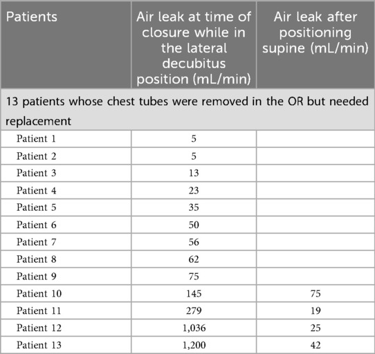 Table 6. Exact air leak measurements of the 13 patients while in the lateral decubitus and supine positions in the OR.