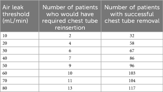 Table 7. Number of patients who would have required chest tube reinsertion vs. those who would have had successful removal if we had changed the air leak threshold.