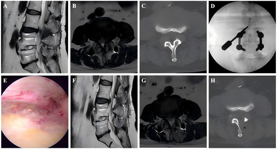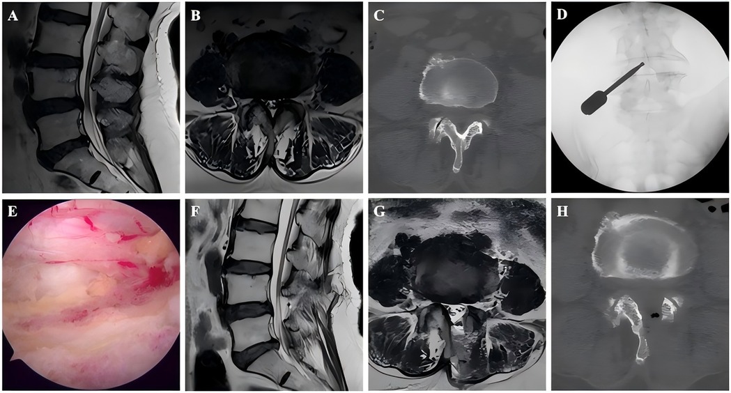 Figure 2. Images from a non-ASD patient treated with UBE. A–B: Preoperative MRI showed L4–L5 LSS. C: Preoperative CT. D: The position of the grinding drill was shown in the fluoroscopic view. E: The nerve was completely decompressed. F–G: Postoperative MRI confirmed spinal canal decompression. H: Postoperative CT showed a lamina defect after partial laminotomy.