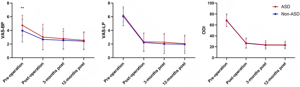 Figure 3. Changes in the VAS-BP, VAS-LP, and ODI scores in both groups compared with preoperative values.