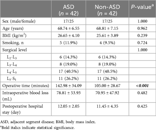 Complications represent a significant concern in ASD management. Notably, the complication rates in the ASD and non-ASD groups were 4.76% (2/42) and 2.38% (1/42), respectively, which were markedly lower than reported rates for revision lumbar fusion surgery (24). No severe complications, such as cardiopulmonary dysfunction, thrombosis, nerve root injury, massive hemorrhage, or surgical site infection, occurred in the study cohort. Furthermore, clinical evidence indicates that spinal fusion revision exacerbates segmental rigidity, triggering compensatory hypermobility at adjacent segments. This biomechanical cascade ultimately contributes to recurrent ASD and implant-related complications, such as screw loosening or rod fracture (25, 26). These biomechanical disadvantages highlight the potential advantage of decompression-only procedures such as UBE.