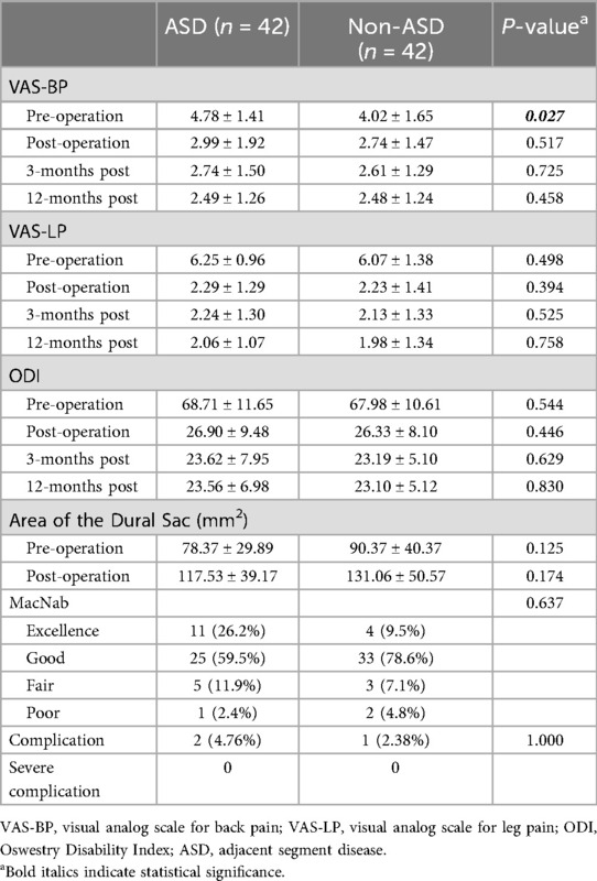 Table 2 compared the preoperative and postoperative levels of BP and LP, functional outcomes, and dural sac cross-sectional area between the ASD and non-ASD groups in the cohort of patients who underwent UBE surgery. Both groups showed significant improvement in VAS-BP, VAS-LP, ODI, and dural sac cross-sectional area after surgery (Table 2). Although the ASD group had a higher preoperative VAS-BP score than the non-ASD group (4.78 ± 1.41 vs. 4.02 ± 1.65, P = 0.027), postoperative outcomes were comparable between groups. There was no significant difference in the postoperative dural sac cross-sectional area between the ASD and non-ASD groups (131.06 ± 50.57 vs. 117.53 ± 39.17 mm2, P = 0.174). The intraobserver and interobserver intraclass correlation coefficients for the measurement of the cross-sectional area of the dural sac were 0.92 (95% CI: 0.82–0.95) and 0.85 (95% CI: 0.78–0.91), respectively, indicating excellent and good levels of reliability. Table 3 summarizes VAS and ODI scores at different follow-up points. The ASD group had significantly higher preoperative VAS-BP than the non-ASD group (P = 0.027), but postoperative scores at 3 days, 3 months, and 12 months showed no statistical difference between groups. The overall trends of pain relief and functional recovery were similar. According to the MacNab criteria, the rates of excellent and good outcomes were 85.7% (36/42) in the ASD group and 88.1% (37/42) in the non-ASD group, showing no significant difference. Overall, UBE surgery provided sustained improvement in pain, function, and quality of life over the 1-year follow-up period (Figure 3).