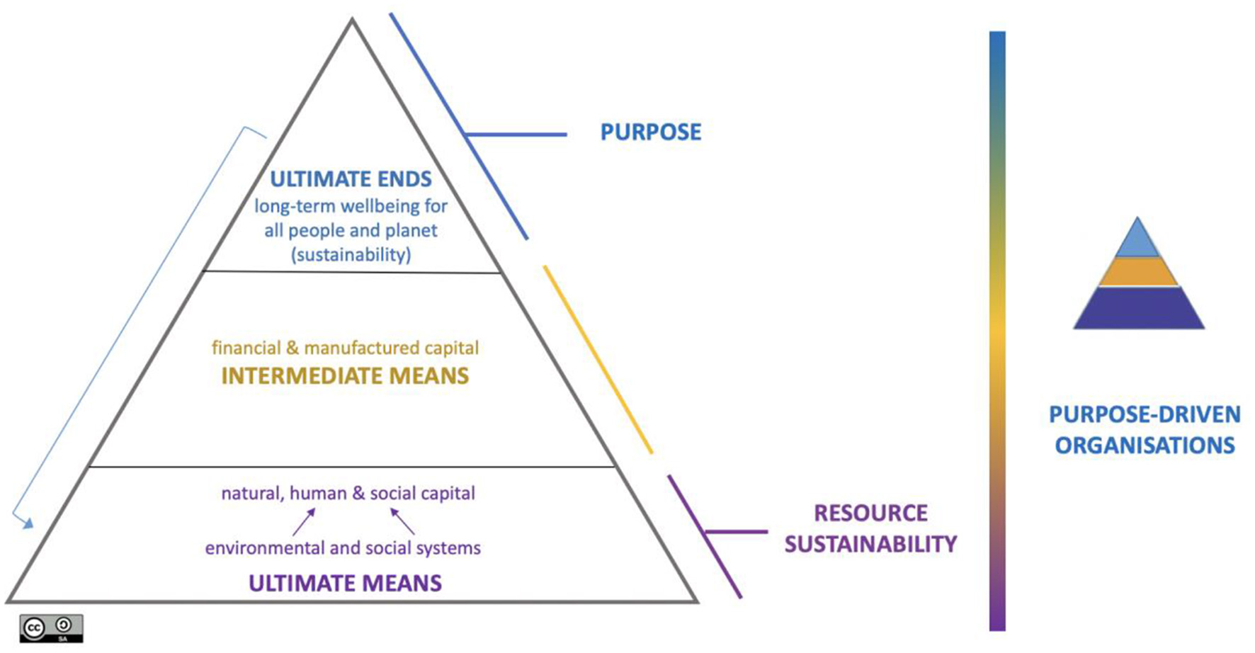 The Wellbeing Economy sets the macro-level economic response to the crisis of faith in BAU but at the meso business level, solutions have come in the form of the concept of “purpose-driven organisations.” Essentially, the concept of “purpose” can be considered as the way to practically operationalise the Wellbeing Economy, by anchoring a company's primary reason to exist to wellbeing outcomes and by relegating financial considerations to an intermediate means to that meaningful end (Hurth and Vrettos, 2021).