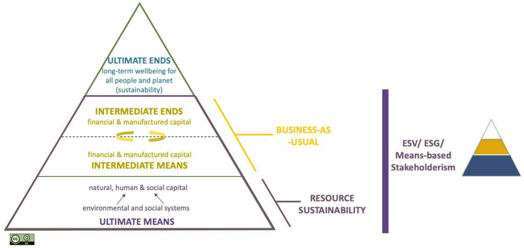 For ESV organisations, therefore, decision-making begins to extend to all resources that value generation rests on, including, crucially, the sustainability of the resource base. As a result, understanding to what extent a company's survival rests on the health of the climate, ecosystems, forests, social equality, mentally healthy workforce etc., and then acting to protect this, becomes central. An ESV approach therefore encapsulates both the middle and the bottom of Daly's triangle (Figure 4) by bringing the resources that underpin value creation into its realm of thinking and action (“resource sustainability”). This new thinking leads to a company displaying a range of positive stakeholder- and sustainability-aligned actions. However, ultimately, their actions are tethered to whether or not they can be justified to ensure the firm's long-term survival and/or optimal financial success. If not, then actions are unlikely to get support. For this reason, these organisations are limited in their sustainability innovations and cannot be considered purpose-driven because their ultimate ends are not anchored to optimising wellbeing.