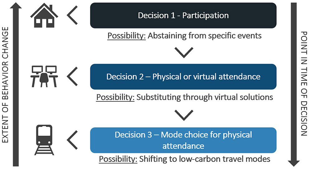 At the individual level, three major strategies can be distinguished (LeQuéré et al., 2015; Baer, 2018; Hamant et al., 2019; van Ewijk and Hoekman, 2020), which are illustrated at different points in time on the travel decision tree and comprise different extents of behavior change (see Figure 1).