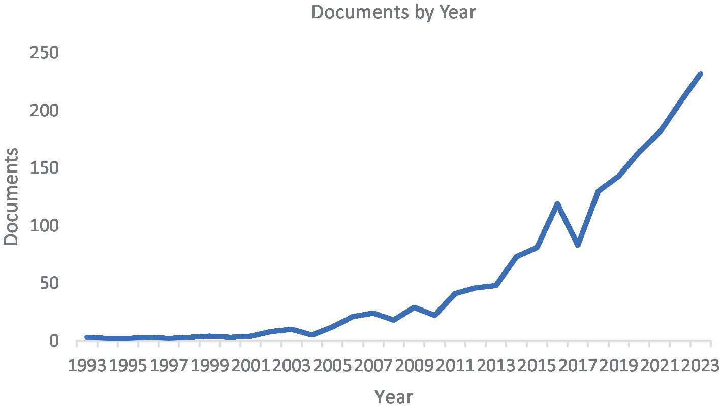 In the first phase of data collection, we conducted a keyword search in the Scopus database using “green consumption” OR “sustainable consumption” OR “eco-friendly product” OR “green consum*” OR “green purchase.” The keywords were searched in the title, abstract, and keywords field under Business, Management, and Accounting categories. The inclusion criteria of this research comprise peer-reviewed academic journals from 1993 to 2023. The period 1993–2023 was chosen because the first article (Lai, 1993) on green consumption was published in 1993. By 2000, only three articles had been published. As shown in Figure 1, the majority (87% of all articles) were published after 2010. The sample was limited to journal articles and excluded book chapters, conference papers, editorials, notes, and short surveys as suggested by (Keupp and Gassmann, 2009). The initial search yielded 1,389 peer-reviewed journal articles. Figure 2 shows the process used to obtain the final journal articles, including the data collection and filtering stages.