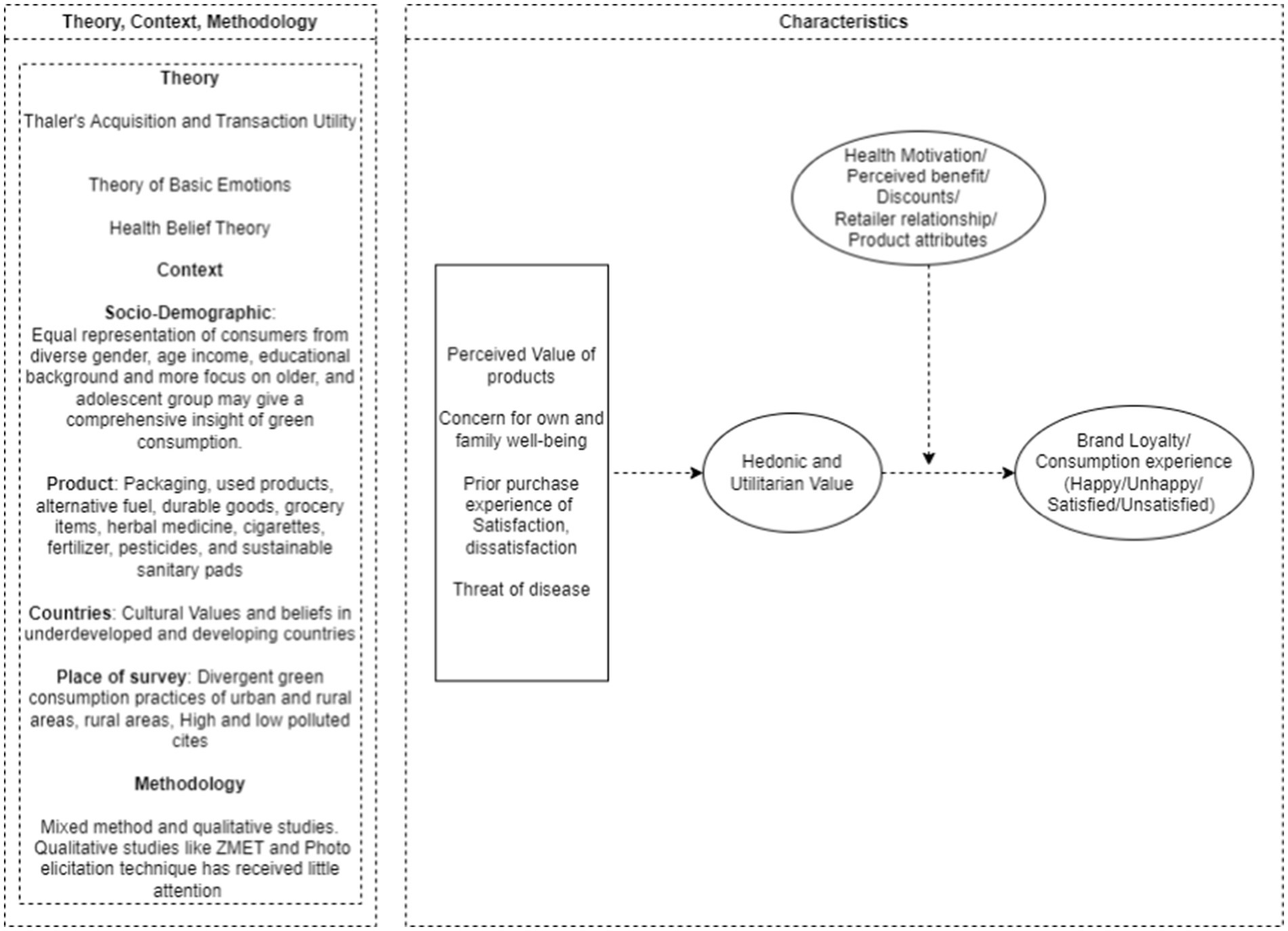 This study makes several significant contributions to the literature on green consumption. Existing literature on green consumption has predominantly surveyed young, educated, urban, and women consumers, leading to a skewed representation of the sample population and limited variation in the results. To address these gaps, the paper recommends future scholars to incorporate economic theories, theory of basic emotion, and health belief theory in their research. Equal representation of samples from diverse genders, income groups, and educational backgrounds could provide more comprehensive insights into the topic. Furthermore, conducting studies across various product categories will help to map which green products are motivated by specific values. Additionally, exploring rural areas, underdeveloped, and developing countries will assist marketers in tailoring their strategies to target these segments of the population effectively. The subsequent sections of this paper are organized as follows. Section 2 provides an overview of the research methodology applied in the research. Specifically, it delineates the steps involved in the review process, including search strategy, selection criteria, data extraction, and data synthesis. Section 3 provides a summary of the literature review. Section 4 scrutinizes prior studies using the Theory-context-characteristics-methodology (TCCM) framework. Section 5 delineates potential research gaps and future research directions in this field. Finally, Section 6 offers concluding remarks, contribution, theory-based agenda for future research, and limitations and future research avenues.