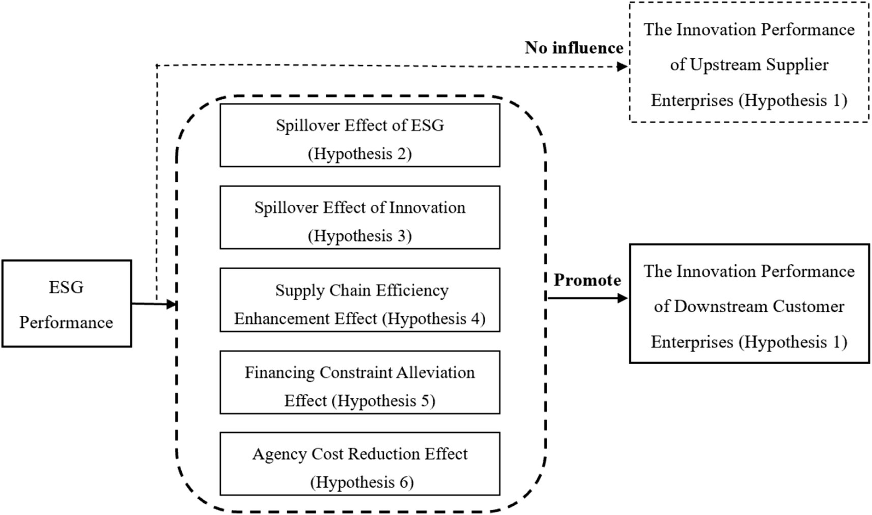 Hypothesis 1: Corporate ESG performance can promote the improvement of innovation performance in downstream firms in the supply chain, but has no significant effect on the innovation performance of upstream firms in the supply chain.