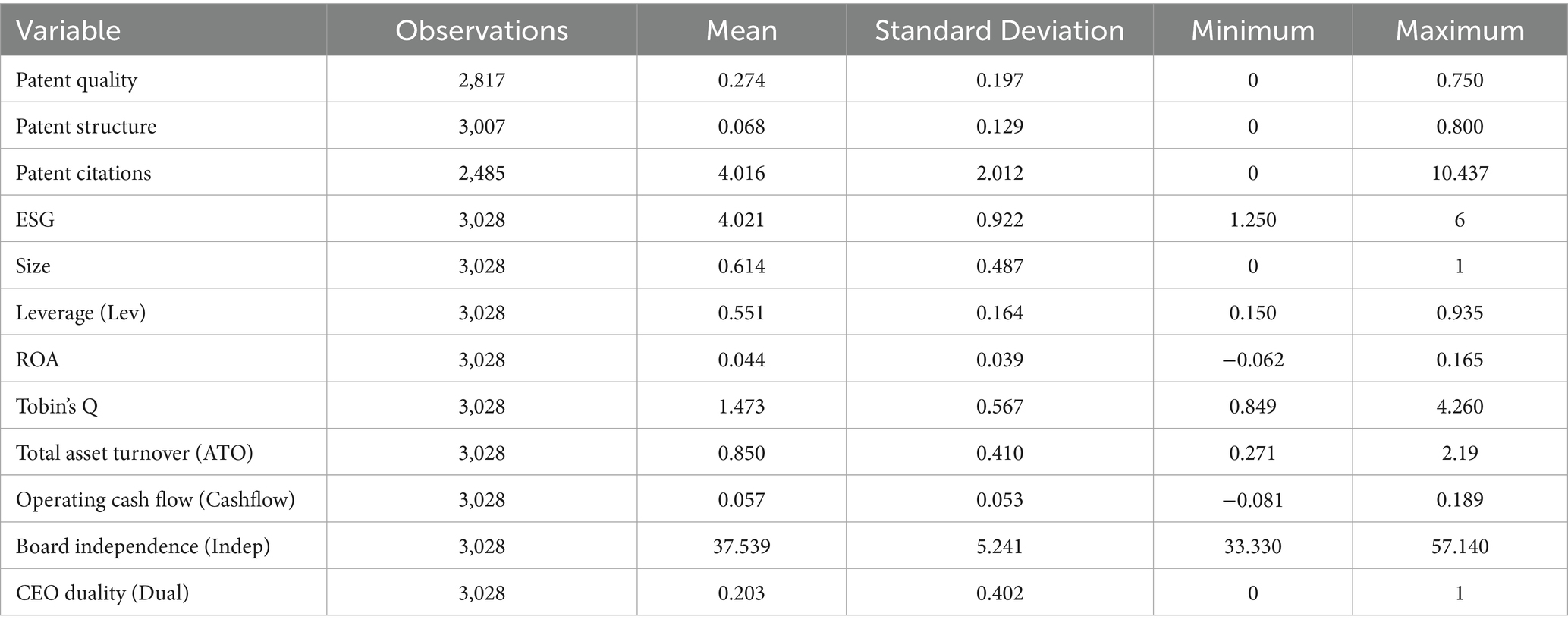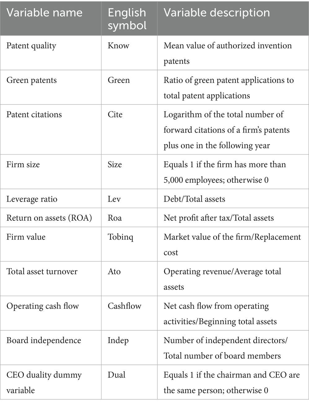 Innovation Performance, measured from three aspects: patent quality, green patents, and patent citations. First, Patent Quality (Know): Measured using the average method of invention authorized patents of listed companies calculated by the knowledge width method (Zhang and Zheng, 2018). The average method of invention application patents is used for robustness tests. Second, Green Patents (Green): The ratio of green patent applications to total patent applications is used as a proxy variable. The natural logarithm of the number of green patent applications plus one is used for robustness tests. Third, Patent Citations (Cite): This paper uses overall innovation quality (Meng et al., 2019), specifically the natural logarithm of the sum of the number of citations by others of patents applied for by the firm in the following year plus 1, as the proxy variable. Table 1 reports the main variables and their definitions.