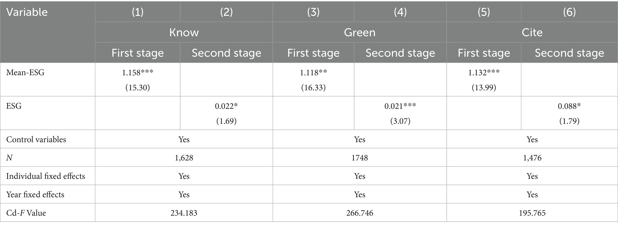 Since there may be a bidirectional causal relationship between corporate ESG ratings and innovation, this study employs the instrumental variable (IV) approach to address endogeneity concerns. Given the baseline conclusion that corporate ESG has a spillover effect on downstream customer innovation, the following analysis focuses primarily on downstream customers. Following the approach of Fang and Hu (2023), the mean ESG rating of other firms in the same industry and year (Mean-ESG) is used as an instrumental variable to test for endogeneity. Columns (1), (2), and (3) of Table 4 present the first-stage regression results of the instrumental variable approach. On one hand, the coefficient of Mean-ESG is significantly positive at the 1% level, indicating a strong correlation. On the other hand, the Cragg-Donald Wald F-statistic exceeds the critical value at the 5% level, suggesting that there is no weak instrument problem, thus rejecting the null hypothesis of weak instruments and confirming the reliability of the results. Columns (2), (4), and (6) show the second-stage regression results, where the coefficients of the mean ESG are 0.022, 0.021, and 0.088, respectively, all of which are significantly positive and consistent with the baseline regression results.