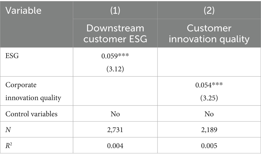 This paper argues that corporate ESG performance positively impacts downstream firms’ innovation performance along the supply chain. Specifically, corporate ESG performance has spillover effects, influencing not only the firm’s own development status but also, through product and service linkages, promoting the enthusiasm and capability of downstream firms to carry out innovation activities. Intuitively, when a firm supplies greener, lower-carbon, and more efficient intermediate products to downstream firms, customer firms can directly utilize the innovation achievements of the upstream firm and, based on this, improve their own production and operations, driving corporate innovation and development. For downstream firms, when innovative changes occur in upstream suppliers’ products or services, they need to adaptively adjust production processes and business models to meet the new demands and technological changes of the upstream firm (Yang et al., 2022). From the perspective of supply chain transmission direction, the influence of ESG performance exhibits a distinct “downward radiation” characteristic. Downstream firms directly face the end market and consumers; their ESG practices are more easily driven by market demand, policies, regulations, and public opinion. When a core firm demonstrates good ESG performance, downstream firms, in order to maintain cooperative relationships and meet the end market’s demand for sustainable products, often proactively adjust their business strategies and increase innovation investment.