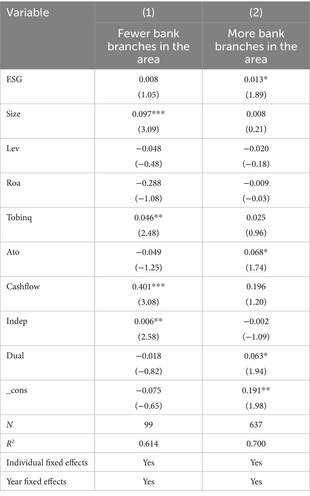 The impact of ESG performance on corporate innovation should also take into account the heterogeneity in the number of local bank branches. Bank branches, as operating entities, are at the forefront of providing products and services to participate in market competition. The efficiency, service quality, and profitability of these branches are closely related. Beyond their commercial attributes, the effective extension of bank branch functions can create significant social benefits, greatly aiding banks in practicing ESG (Environmental, Social, and Governance) principles and achieving ESG goals (Huang and Wang, 2021). Currently, to enhance transparency and promote the robust development of green credit, commercial banks regularly publish comprehensive reports that include not only financial information but also extensive disclosures on ESG information related to both the bank and the enterprises they serve, helping to mitigate issues of environmental information asymmetry. To study this, we conducted an in-depth analysis of the national banking and economic statistics from 2009 to 2022 as published by the China Banking Regulatory Commission (CBRC) on its official website. We aggregated the number of bank branches in each prefecture-level city and divided them into two groups: regions with dense bank branches and those with sparse bank branches, based on the median number of branches. Table 12 reports the heterogeneity results related to the number of bank branches. The empirical results show a regression coefficient of 0.013, which is significantly positive at the 10% level. This indicates that in regions with a higher number of bank branches, the innovation spillover effect of corporate ESG ratings is more pronounced for downstream firms.