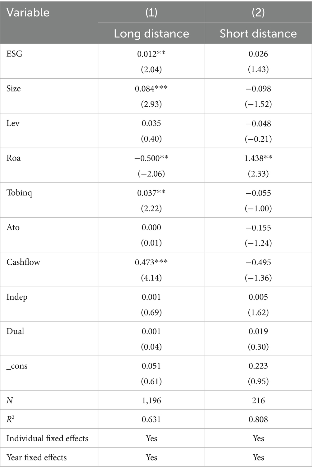 Referring to the practices of previous literature (Yang et al., 2022; Li et al., 2022), this paper selects corporate characteristic variables such as firm size (Size), corporate debt-to-asset ratio (Lev), return on assets (Roa), Tobin’s Q (TobinQ), return on total assets (Ato), operating cash flow (Cashflow), as well as corporate governance structure variables like board independence (Indep) and a dummy variable for CEO-Chair duality (Dual). Meanwhile, this paper controls for individual and year fixed effects to exclude the influence of unobservable factors on the estimation results. Table 1 reports the main variables and their definitions.
