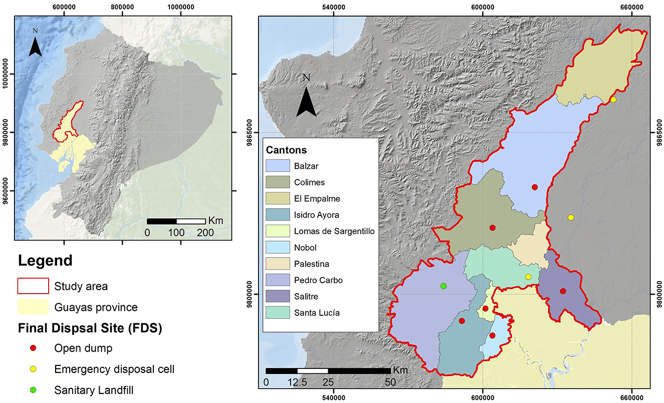 Ecuador generates approximately 5.3 million tons of solid waste per year, with a per capita rate of 0.81 kg per inhabitant per day (Ministerio de Ambiente Agua y Transición Ecológica, 2023). Forty-seven percent of Ecuador's solid waste corresponds to open dumps, most of which are concentrated in coastal regions (Ministerio de Ambiente Agua y Transición Ecológica, 2023). Thirty-eight percent of the waste is generated in Guayas province (5,500 tons per day), where 68% of the FDS operates without technical or environmental control (Ministerio de Ambiente Agua y Transición Ecológica, 2023). Some municipalities in Guayas province lack their own disposal sites, instead resorting to informal agreements with neighboring municipalities. This situation has led to the transfer of waste to facilities outside the province.