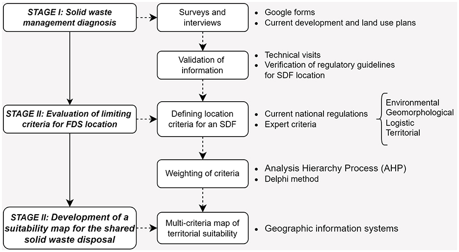 The methodology offers a centralized approach to solid waste management, with a comprehensive perspective that incorporates the GCWP concept in the selection of areas suitable for final disposal, optimizing transportation routes to the FDS, reducing operating costs associated with solid waste transport, and facilitating informed decision-making. This approach addresses environmental, logistical, geomorphological, and territorial aspects, thus strengthening inter-municipal management. The study consisted of three phases (i) Solid waste management diagnosis, (ii) Evaluation of limiting criteria for the FDS location, and (iii) Development of a suitability map for the shared solid waste disposal (Figure 2).