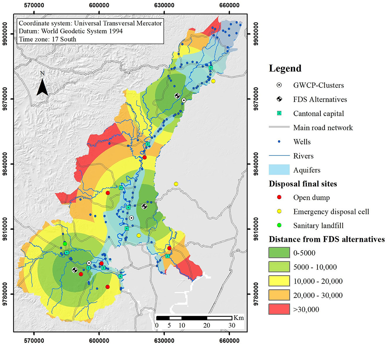 Figure 6 shows the position of the proposed FDS relative to access routes and the three most highly weighted criteria (aquifers, wells, and rivers). In most cases, the cantonal capitals are located between 5 and 20 km from the proposed FDS (Figure 6).