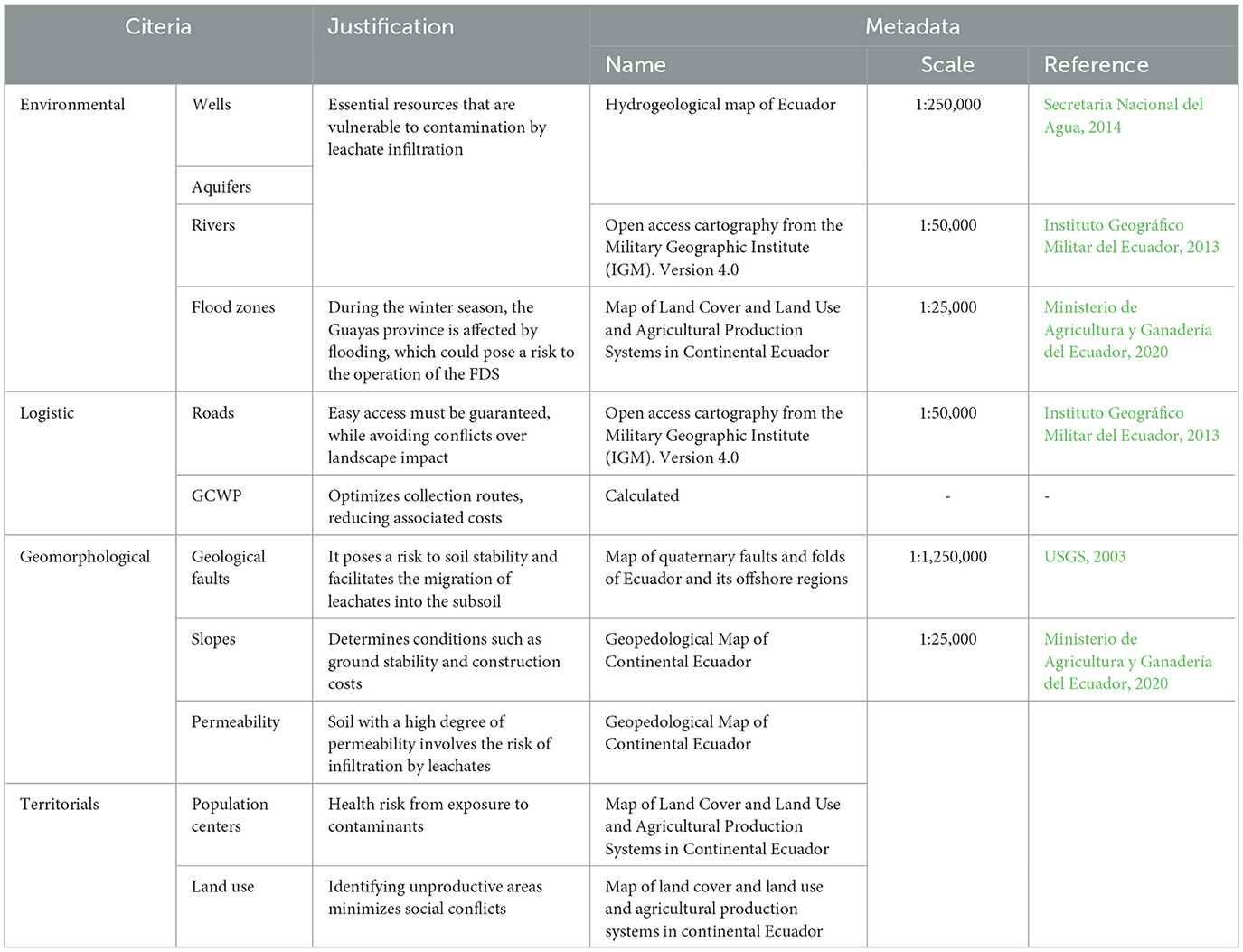 The GCWP was integrated into 11 criteria grouped into four axes (environmental, logistics, geomorphological, territorial), considered according to the local context, current regulations, and several studies on similar topics (Ministerio del Ambiente Agua y Transición Ecológica, 2003; Toro et al., 2016). The inclusion of the GCWP corresponds to a logistics strategy that complements the evaluation of traditional criteria that can directly influence the technical feasibility of FDS. It allows guiding decision-making from the perspective of optimizing transport routes in the context of intermunicipal collaboration. The resources used for the geospatial analysis consisted of cartographic information available in the geoportals of state institutions related to territorial management and planning (Table 1).