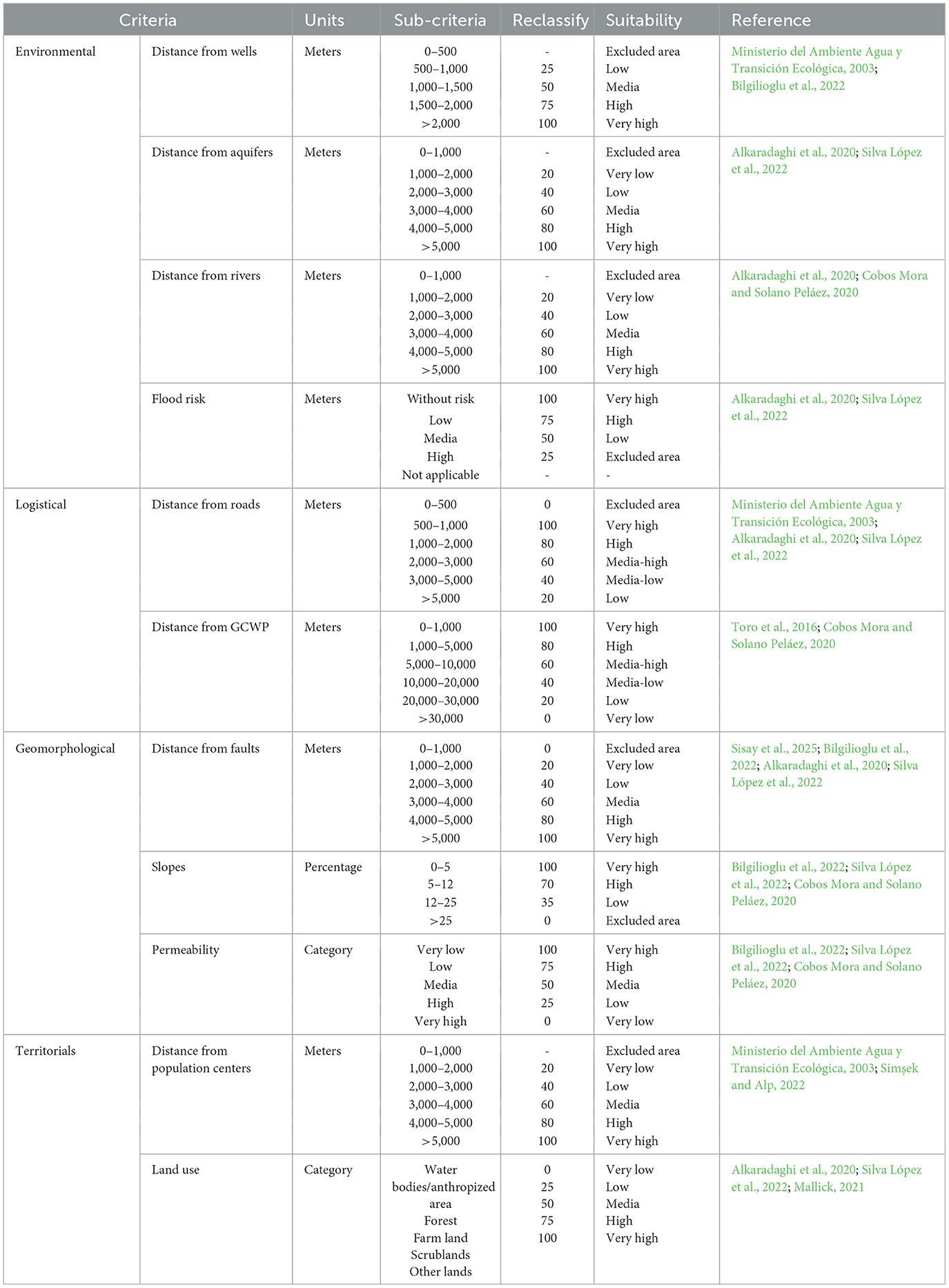 The relevance of the criteria varies in each study; for example, Ali et al. (2023) assigned the highest weighting to the criterion of distance from the road network, which is associated with reduced operational and construction costs of landfills. This discrepancy depends on the objectives of the study, local context, available information, and the subjectivity of experts (Sahid et al., 2023; Hidalgo Zambrano et al., 2021; Carrión-Mero et al., 2024). To reduce bias due to the adaptive nature of multi-criteria analyses (Kharat et al., 2016a,b), suggest the application of methodologies such as Delphi or fuzzy techniques.