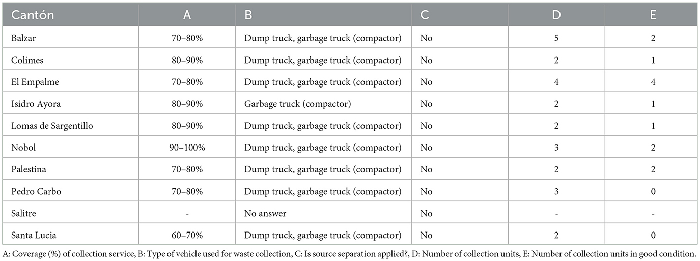 Municipalities report coverage of over 70%; however, in the case of Santa Lucía, coverage is between 60% and 70%. In general, collection in urban areas is carried out using compactor trucks. By contrast, dump trucks are used in rural areas because of the limited availability of vehicles and lower waste production in these areas. However, half of the collection vehicles in the cantons were in poor condition, except for the cantons of El Empalme and Palestina. Furthermore, waste is not separated from the source, meaning that the materials are not formally recycled (Table 3).