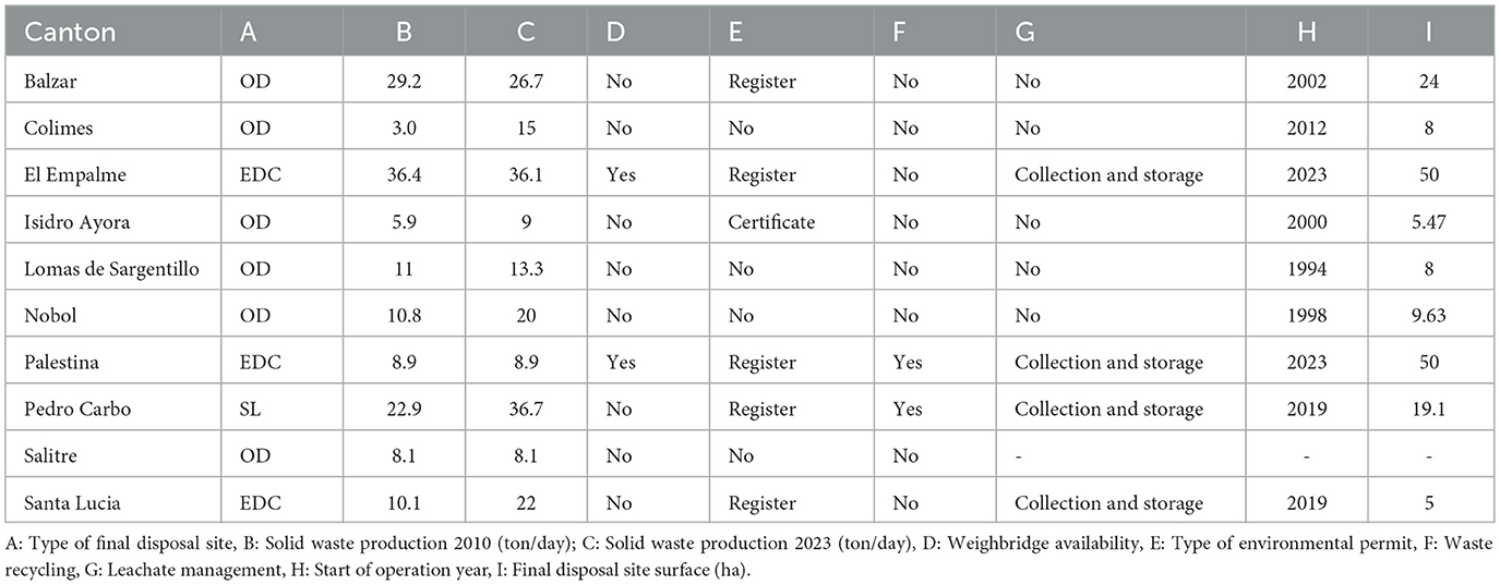 The study conducted surveys based on open-ended and multiple-choice questions through Google Forms, targeting the authorities responsible for solid waste management in the 10 cantons, and addressed three interest areas: (a) type of management, (b) collection service, and (c) operation and capacity of final disposal sites. The survey results were supplemented with information available in current planning and land use reports for each municipality and interviews with municipal authorities responsible for environmental management, which allowed the identification of management constraints related to funding and the current status of the SDF. The information obtained in this first stage was corroborated through field visits, assisted by technical staff from the Environmental Management Department of the Guayas Provincial Government, to assess compliance with current environmental regulations regarding the presence of nearby population centers, crops, water pollution, access roads, and proper leachate management (Ministerio del Ambiente Agua y Transición Ecológica, 2003). The tons of solid waste per day analyzed in this study were obtained from information available from the state agency in charge of environmental management (Ministerio de Ambiente Agua y Transición Ecológica, 2023) and public documentation from the Provincial Decentralized Autonomous Government of Guayas (Gobierno Autónomo Descentralizado Provincial del Guayas, 2012).