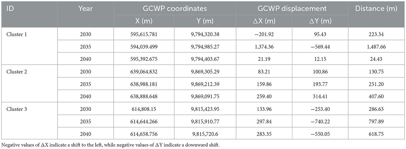 Table 6 shows the displacement of the GCWPs of clusters 1, 2, and 3 concerning the GCWP location in 2023. Based on the projection of waste production, it can be seen that the GCWPs of clusters 2 and 3 present displacements of < 1 km, with the GCWP of Cluster 2 moving the least distance. The projected production in Cluster 1 generates a GCWP displacement of 1.71 km in 2035, but this distance would be reduced in 2040.