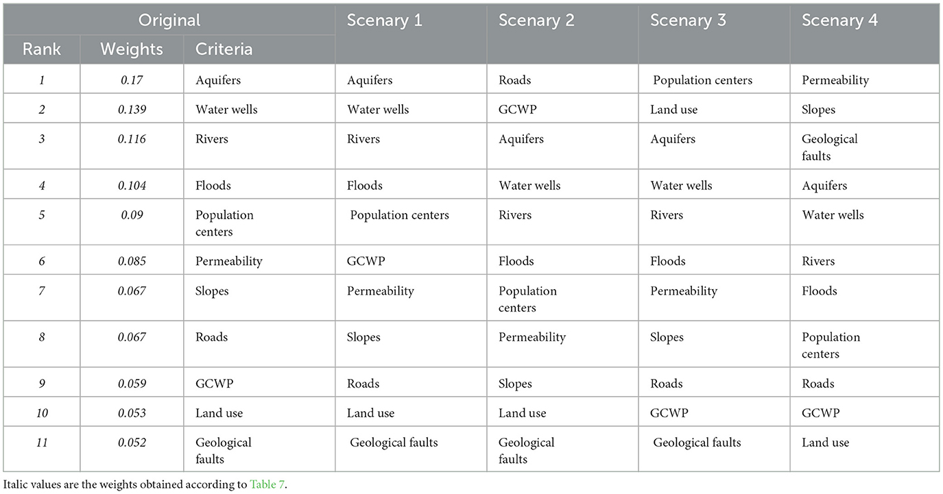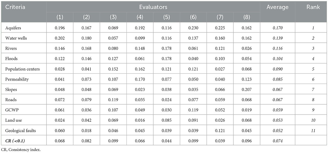 According to the assessments carried out by the focus group, a consistency level of < 0.1 was achieved in the results, meaning that the criteria related to surface and groundwater sources were the most relevant for the study (individual results for each comparison matrix are presented as Supplementary material). Other pertinent criteria included flooding, distance to population centers, and soil permeability (Table 7).