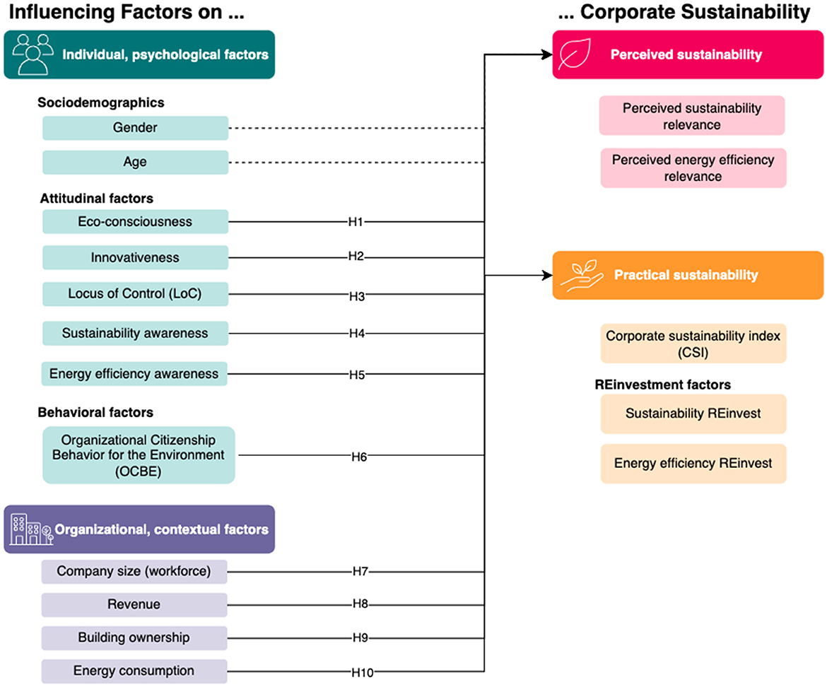Building on the findings of the qualitative study, the subsequent step involved quantifying the identified sustainability measures and analyzing potential explanatory and influencing factors. The quantitative analysis focused on managers as key decision-makers regarding sustainability within companies, a role highlighted by both the existing literature and our qualitative pre-study. To assess corporate sustainability, we distinguish between perceived sustainability, reflecting a company's ideological commitment to sustainability, and practical sustainability, representing the tangible sustainability measures and policies implemented. This distinction is intended to address the disconnect described in the literature, whereby sustainability issues are widely recognized as relevant within companies, yet are not implemented in a manner that reflects their perceived importance (Hahn and Aragón-Correa, 2015). The following section will detail both constructs and their underlying variables. Figure 3 provides an overview of the analyzed influencing factors and the underlying hypotheses for the statistical analysis.