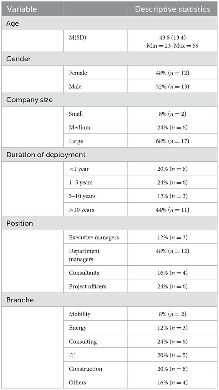 The descriptive statistics referring to the interviewed participants are presented in Table 1. Overall, N = 25 participants (age range: 23–59 years) took part in the interview, evenly split between genders (12 female, 13 male). Most participants worked in companies located in North Rhine-Westphalia in Germany. According to the German Federal Statistical Office, companies are classified as small (up to 49 employees), medium-sized (50–249 employees), and large (more than 250 employees). Most of the participants worked in large companies (n = 17), and fewer in medium-sized (n = 6) or small companies (n = 2). Professional expertise and lengths of stay in the company varied between 3 months to 20 years. Participants came from various industry branches (mobility, energy, consulting, IT, construction) and worked in different positions (executive managers, department managers, consultants, or project officers). All participants reported a high interest in sustainability. Interviews lasted between 30 and 90 minutes.