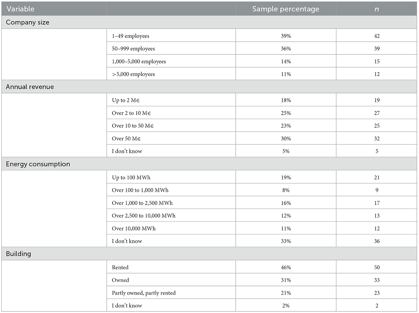In the following sections, the thematic focus shifts to the organizational context. Participants were asked to provide the basic key data of their respective companies: sector, company size (number of employees), annual revenue, energy consumption, and building type (rented, owned, or partly owned and rented). An additional “I don't know” option was provided.