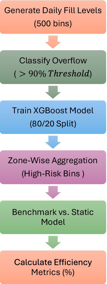 This project creates a single smart waste management system by combining AI, IoT, and graph-theoretic modeling. The system begins with simulated smart bin data, which includes temporal fill levels, geospatial positions, and overflow events. The simulation pipeline followed a structured sequence: (i) daily fill levels were generated for 500 bins across five zones using zone-specific growth functions; (ii) overflow risk was assigned based on the >90% threshold; (iii) XGBoost was trained on 80% of the data and validated on 20%; (iv) predictions were aggregated zone-wise to calculate percentages of high-risk bins (Table 2); (v) comparative benchmarking against a static model yielded efficiency percentages (Table 3). This step-by-step approach, illustrated in Figure 2, avoids uncertainty in percentage computation and ensures reproducibility.