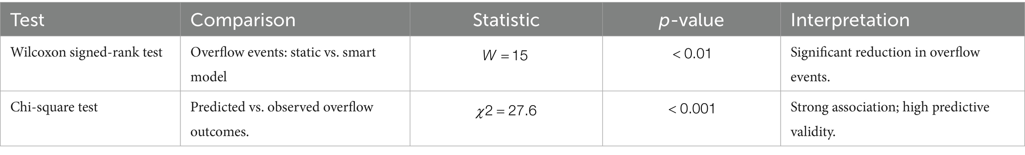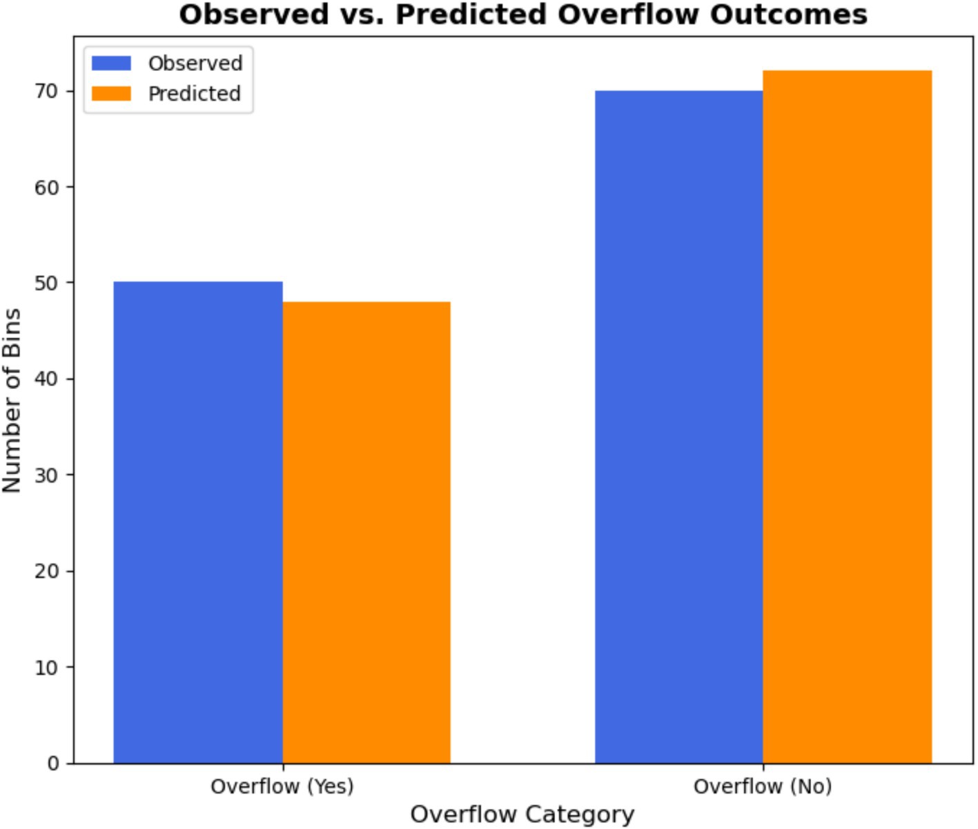 Statistical tests were carried out to ensure that the findings were reliable. A Wilcoxon signed-rank test comparing overflow incidents across static and smart models revealed a significant difference (), indicating that the observed reductions were not caused by random variation. A Chi-square test showed a significant correlation between anticipated and observed overflow labels, indicating the AI model’s predictive validity. The detailed results of these tests are summarized in Table 8. As shown in Figure 8, the predicted overflow closely aligns with observed outcomes across the simulation period. Figure 9 depicts the performance of overflow classification by comparing the number of bins predicted to overflow with actual observations. The model correctly recognizes both overflow and non-overflow bins, with small differences between predicted and observed numbers. This agreement strengthens the validity of threshold-based classification and promotes the use of predictive analytics in operational planning.