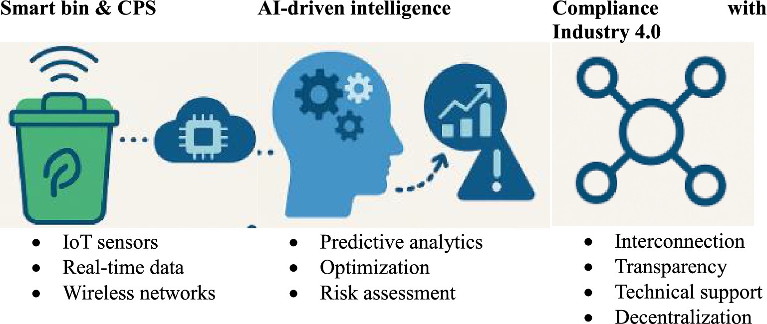 Industry 4.0 relies heavily on CPS, which allow machines to interface with digital platforms and with one other. In the proposed framework, smart bins function as cyber-physical assets equipped with sensors that monitor fill levels, temperature, and overflow risk in real time. This IoT-enabled physical layer continuously streams data to a cloud-based analytics engine, enabling real-time decision-making. A centralized processing unit receives data from each bin, which acts as a node in a decentralized sensor network, using wireless networks (such as LPWAN, 4G, and 5G). The three main markers of a successful CPS-based smart city system-autonomy, transparency, and scalability are improved by this framework (Rajput and Singh, 2020). A key component of CPS in Industry 4.0 systems, closed-loop feedback control is made possible by the interplay of the physical environment (waste accumulation), digital infrastructure (data processing and AI algorithms), and human interface (municipal operators) (Lee et al., 2015). This continuous feedback loop between physical conditions, digital analytics, and human decision-makers exemplifies the core principles of CPS in Industry 4.0.